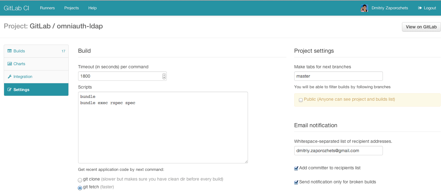 Today we release a new version of GitLab CI. The main new feature of this release is the ability to get email notifications. You can configure a list of email notification recipients per project. In addition GitLab CI can send emails to the author of the build commit. You have the choice of receiving notifications for all builds or only for failed builds.